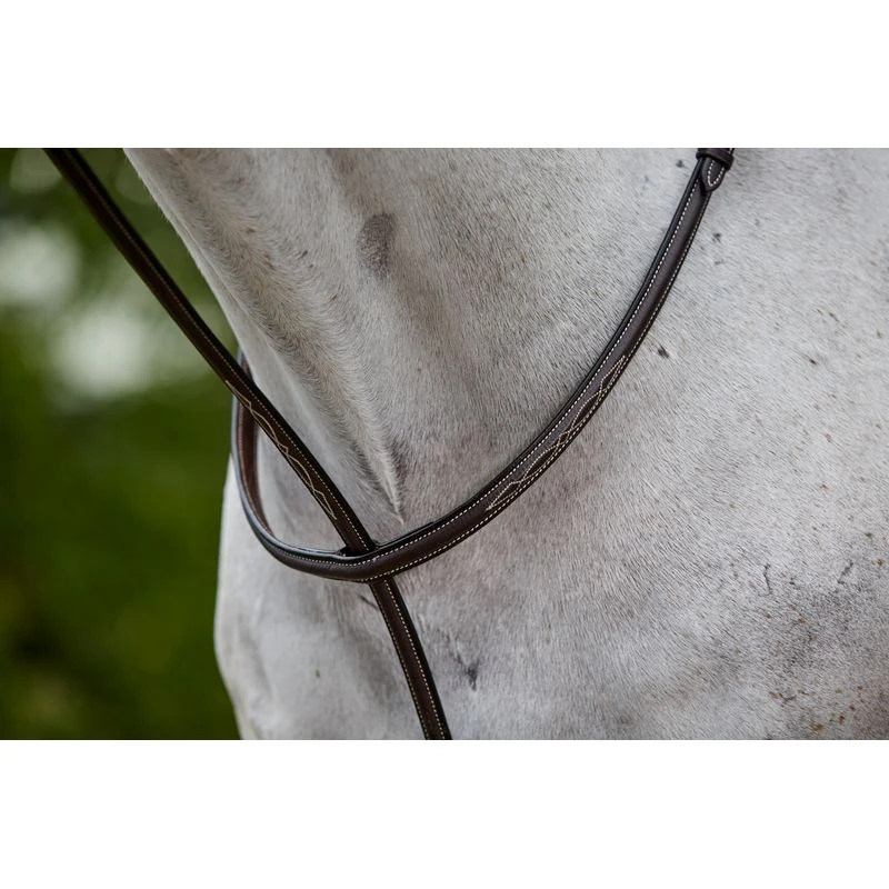 The Collegiate Fancy Stitched Raised Standing Martingale coordinates effortlessly with both the Collegiate Mono Corwn and Comfort Crown Fancy Stitch bridle collections.