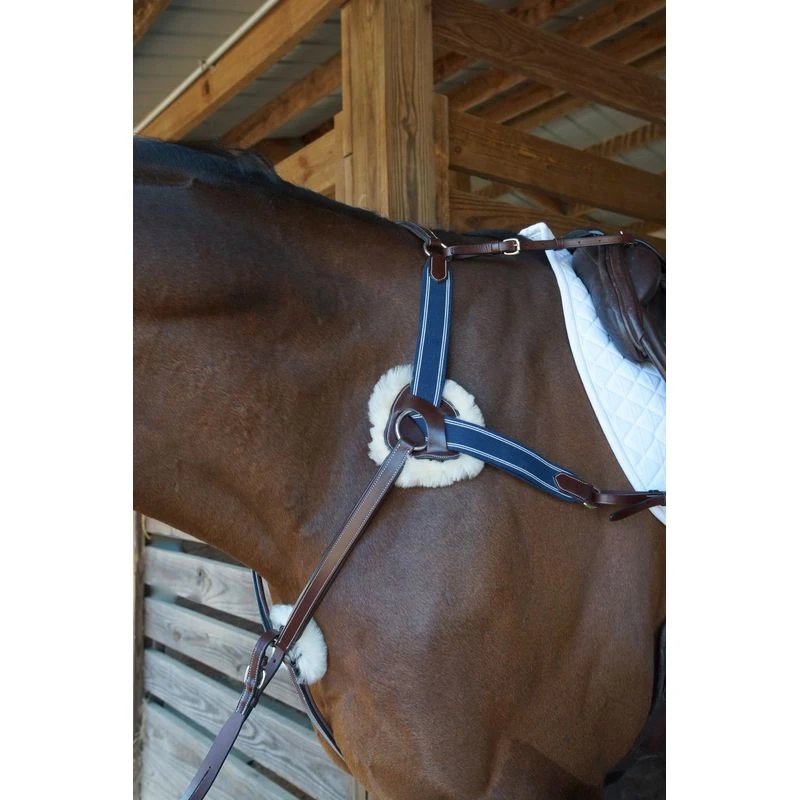Features of the Nunn Finer 5-way Breastplate with blue elastic include five contact points that provide a fantastic and secure fit, easy adjustability, American leather, and matching running attachment. Now with removable sheepskin attachments for easy cleaning.